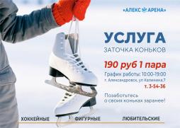 Уважаемые жители Александровского муниципального округа, предлагает вам услугу по заточке хоккейных, фигурных и любительских коньков. г. Александровск, крытый каток "АЛЕКС-АРЕНА", ул. Калинина, 7, телефон 8(34274)35436. График работы: 10:00-19:00.